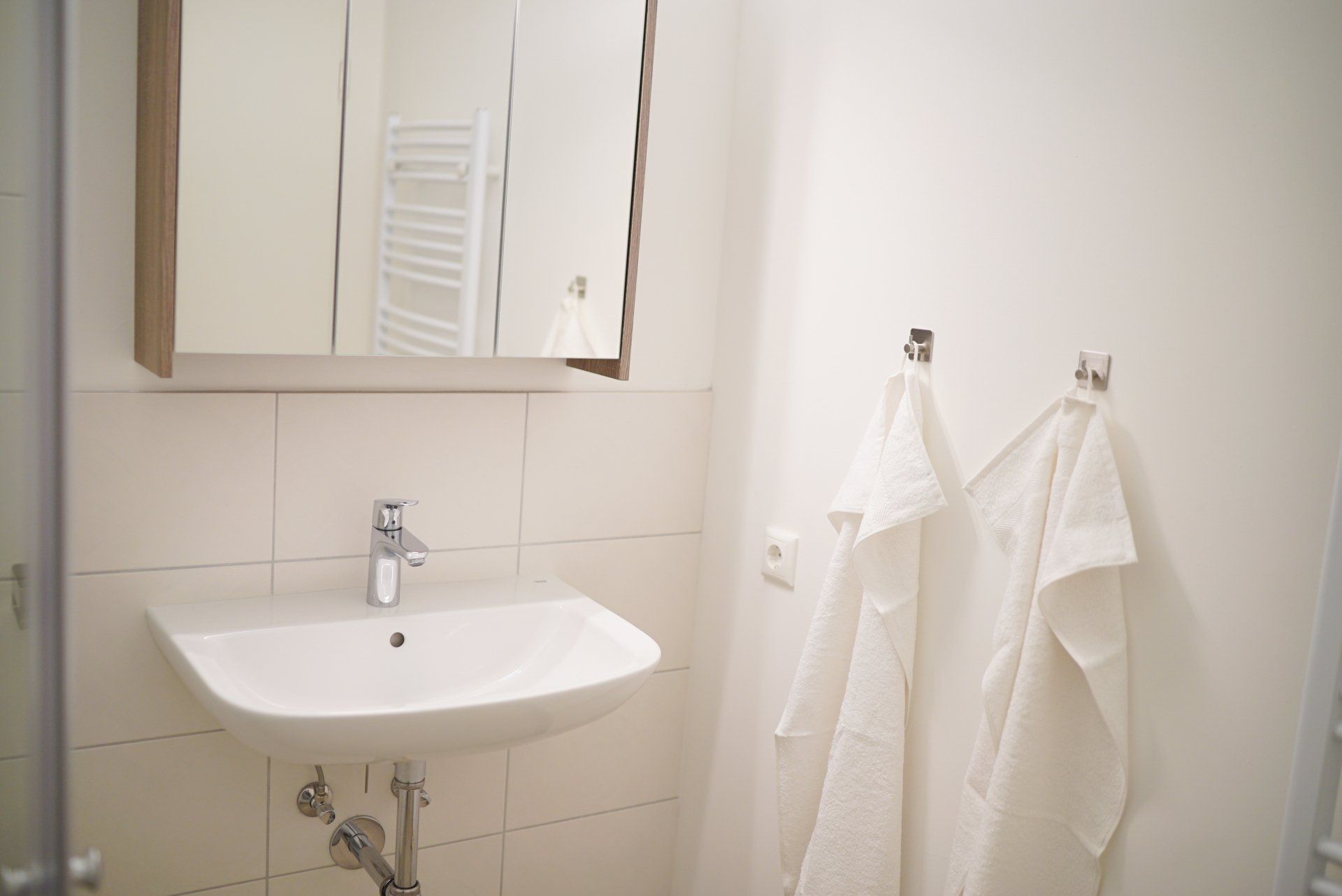 Die Einzimmerwohnungen sind voll ausgestattet und besitzen eine ausgestatteten Einbauküche mit Spüle, Backofen, Herd und Kühlschrank inkl. Gefrierfach. Das moderne Badezimmer besitzt eine bodengleiche Dusche, ein WC, ein Waschbecken und einen Spiegelschrank mit genügend Platz für ihre persönlichen Hygieneartikel.